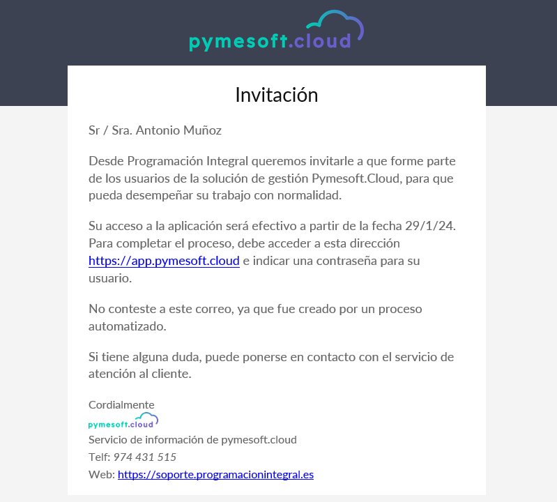 Correo de invitación que recibe el usuario