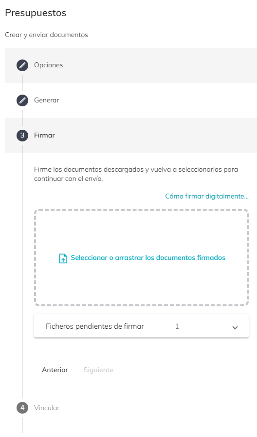 Una vez firmados los documentos, es necesario seleccionarlos de nuevo desde el asistente para continuar con el proceso de envío de documentación.