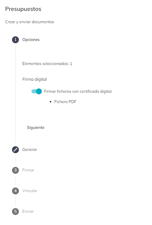 En el primer paso del asistente se definen las opciones de envío y es posible indicar si se desea firmar los ficheros generados con certificado digital.