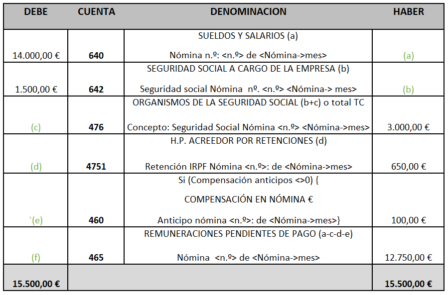 - Importe Neto: Salario final que el empleado recibe después de que se hayan deducido los impuestos, cotizaciones a la seguridad social y otras deducciones obligatorias. Se contabiliza (en le haber) de la cuenta 565: Remuneraciones pendientes de pago.