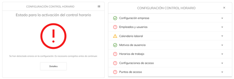 Una vez respondidas las preguntas iniciales, el sistema procederá a verificar el estado de la configuración para la activación del control horario. Es importante tener en cuenta que, en este primer acceso, es normal que se muestren mensajes de error relacionados con la configuración, ya que aún no se han completado ciertos ajustes necesarios.