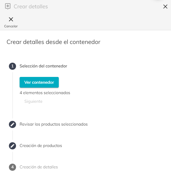 Una vez pulsado el botón, aparece el asistente para la importación, donde en el primer paso podemos revisar el contenedor y si fuera el caso, añadir más productos al mismo, o bien seleccionar los elementos del contenedor.