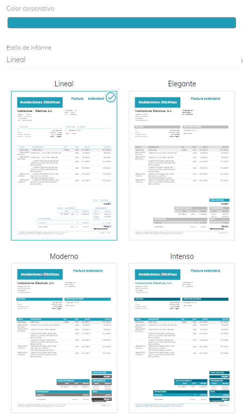 En cada una de las empresas se permite personalizar el color corporativo así como del estilo de informes a utilizar. Estas dos características junto con el logo de la empresa permiten adaptar de forma rápida y sencilla los informes emitidos desde la aplicación.